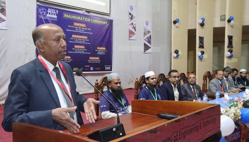 শোভাযাত্রা শেষে কেন্দ্রীয় মিলনায়নে রুয়েট ইইই ডে উপলক্ষে আয়োজিত উদ্বোধনী অনুষ্ঠানে প্রধান অতিথি হিসেবে বক্তব্য রাখেন উপাচার্য অধ্যাপক ড. মো. জাহাঙ্গীর আলম।